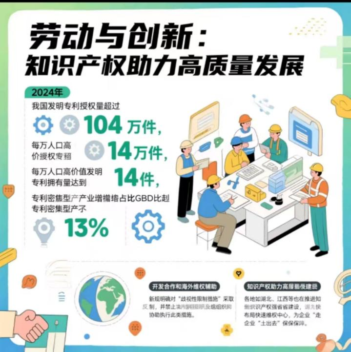 2024年的數據顯示,我國發明專利授權量超過104萬件,每萬人口高價值發明專利擁有量達到14件,專利密集型產業增加值占GDP比重超過13%。這些數字背后,是無數勞動者的智慧成果。我國正加速建設知識產權強國,深化國際合作與海外維權援助。例如,新規明確對“歧視性限制措施”采取反制,并禁止境內組織協助執行此類措施。各地如湖北、江西等也在推進知識產權強省建設,布局快速維權中心,為企業“走出去”保駕護航。這些舉措不僅提升了我國在全球知識產權領域的地位,也為創新者提供了更加有力的法律支持。