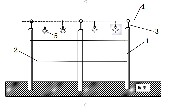 圖中:1、水泥柱;2、鋼絲;3、電纜支架;4、電纜;5、照明燈。