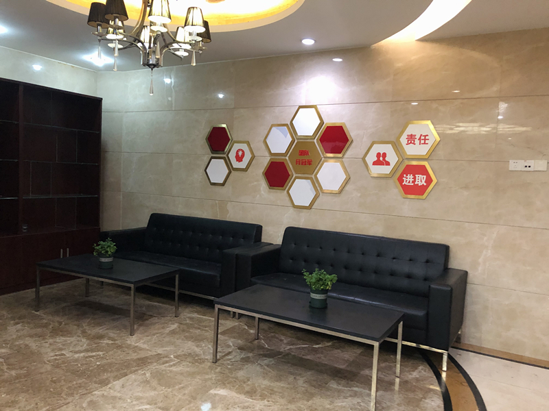 當前可乘做電梯到達10樓,電梯打開,直接到達我司前臺,如圖所示: 前臺整體呈倒月牙形,后方兩側各自為人資部和客服部。大廳設有等候區,分別為來訪客人以及面試者休息等待用。